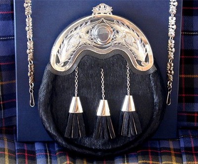 | | The formal Baron's sporran was magnificently made and engraved by Ian Grant, the only heraldic hand engraver in Edinburgh, of premium Greenland black sealskin and of hallmarked sterling silver. |