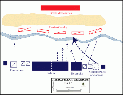 ძვ. წ. 334 წლის მაისში ალექსანდრეს არმიამ 150 ტრირემის მეშვეობით ჰელესპონტი გადაკვეთა.პლუტარქე გვამცნობს, რომ ალექსანდრეს არმიის რაოდენობა სხვადასხვა წყაროების მიხედვით 34,000-დან 46,000 მეომრამდე მერყეობს. მაკედონიაში ალექსანდრემ თავისი გენერალი ანტიპატრე დატოვა 12,000 ქვეითით და 1,50