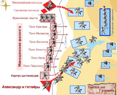 | | მაკედონელტა შეტევა | მა ესკადრონმა 25 მხედარი დაკარგა. მას შემდეგ კი, რაც მემნონს სხვა სპარსელებიც წამოეხმარნენ, მაკედონელებმა სერიოზული დანაკარგები იგემეს. ასე რომ სპარესლებმა ეს იერიში მოიგერიეს. მაკედონელების დიდი ნაწილი დაიღუპა, დანარჩენებმა ალექსანდრესკენ დაიხიეს.
