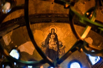 | | აია სოფიის ტაძრის მოზაიკა, იუსტინიანე და კონსტანტინე იმპერატორები ქედს იხრიან ყოვლადწმინდა ღვთისმშობლისა და ყრმა იესოს წინაშე |